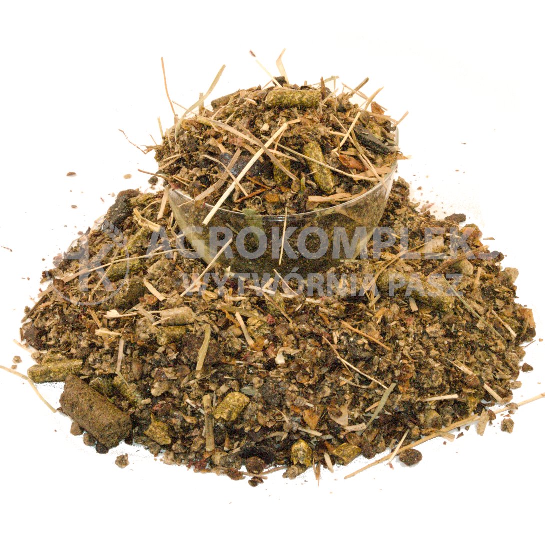 Skład: wysłodki buraczane niemelasowane, susz z traw granulowany, poekstrakcyjna śruta słonecznikowa, susz jabłkowy, makuch lniany, makuch z czarnuszki, otręby ryżowe granulowane, susze ziołowe (babka lancetowata, tymianek, oregano, pokrzywa), olej roślinny rydzowy, wapń z alg morskich, chlorek sodu, fosforan 1-Ca, mieszanka ziołowa Herball Resp*.